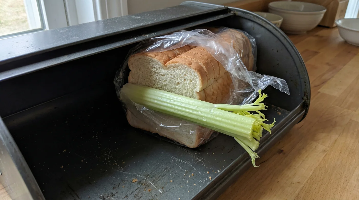 Du stehst in der Küche, das Kaffeewasser beginnt leise zu sieden. Die Vorfreude auf ein weiches, warmes Sandwich am Morgen ist greifbar. Doch als du den Brotkasten öffnest, schlägt dir dieser feine, leicht säuerliche Geruch entgegen. Ein Blick auf dein Golden Toast bestätigt die morgendliche Enttäuschung: Ein blassgrüner Flaum hat sich lautlos über die Ränder der Rinde gelegt. Oder, im ebenso frustrierenden umgekehrten Fall, die Scheibe fühlt sich in deinen Fingern an wie ein sprödes Stück Karton. Es ist ein ständiger, leiser Kampf in unseren Küchen, dieser tägliche Balanceakt zwischen dem kompletten Austrocknen und der plötzlichen Schimmelbildung. Hier kommt ein scheinbar absurder Ratschlag ins Spiel, der jeglicher Intuition und traditionellen Lagerungsregeln widerspricht: Lege einen gewaschenen Stangensellerie zu deinem trockenen Brot. Ein nasses Gemüse zu Backwaren? Genau das. Diese unscheinbare, grüne Stange fungiert als perfekter, natürlicher Luftfeuchtigkeitsregulator, der kommerzielles Toastbrot wochenlang weich, fluffig und völlig schimmelfrei hält.
