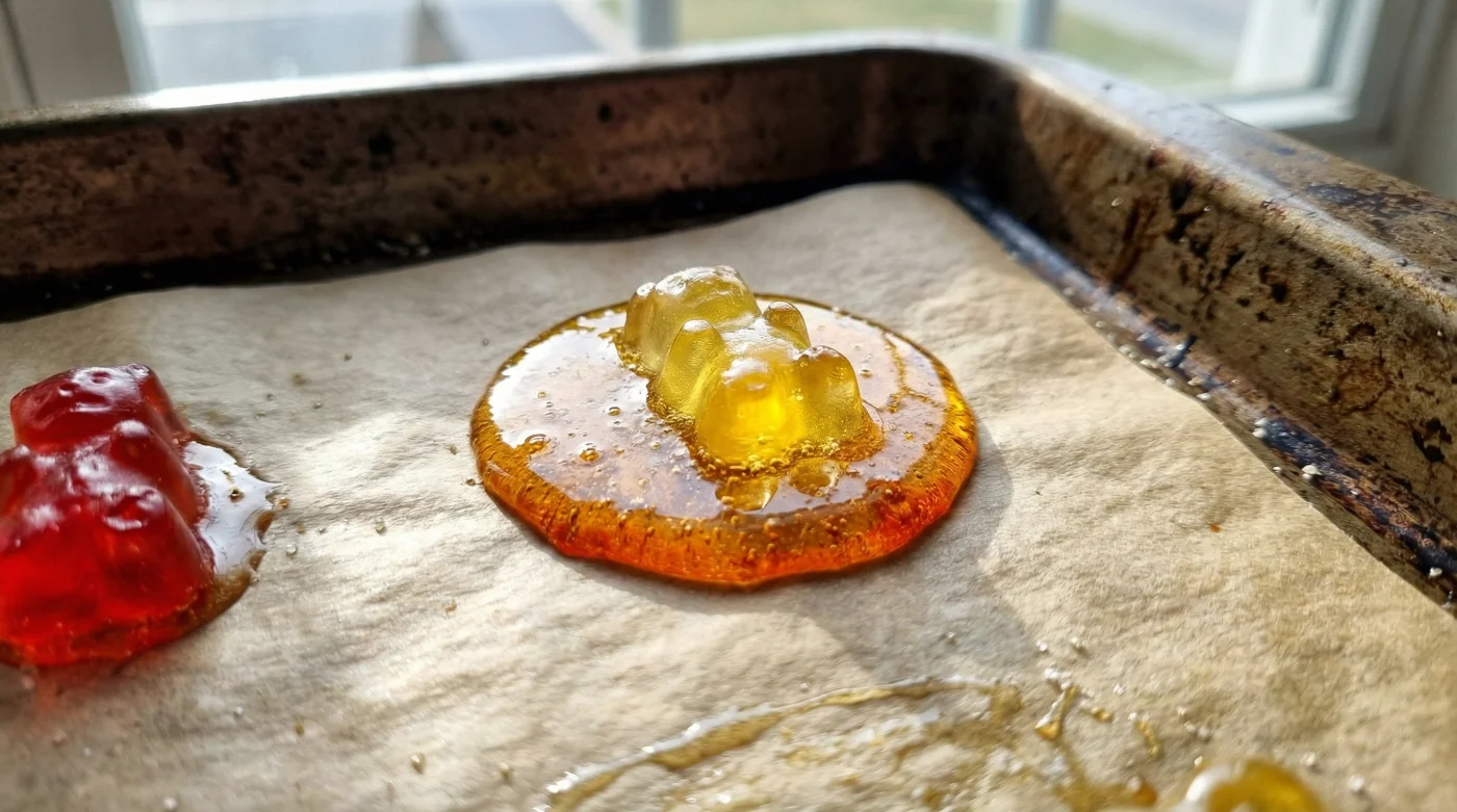 Wir behandeln industriell hergestellte Süßigkeiten oft mit einer gewissen pragmatischen Respektlosigkeit. Sie werden nebenbei konsumiert, oft ohne echte Achtsamkeit. Doch im Grunde bestehen diese kleinen Figuren aus einem hochkomplexen Gerüst von Glukosesirup, Zucker und Gelatine. Die zentrale Metapher für diesen Prozess ist die Schwerkraft des Zuckers: Gibt man ihm gezielt Hitze, bricht die gewohnte, feste Struktur zusammen. Die Moleküle entspannen sich, fließen sanft auseinander und suchen sich einen neuen, flachen Weg. Die Gelatine verliert ihren zähen Halt, während der Zucker zu kochen beginnt und kleine, fragile Blasen an die Oberfläche wirft.