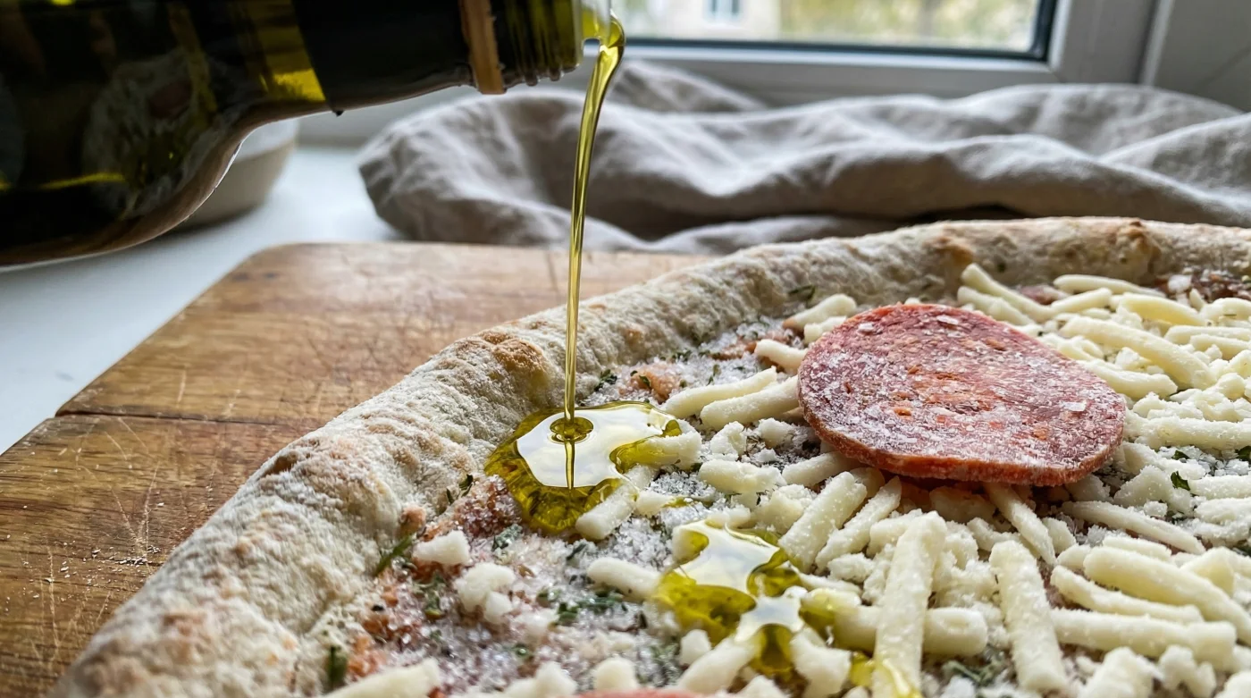 Die Lösung für dieses Problem kostet dich lediglich zwei Sekunden und wenige Cent. Die Rettung ist ein gezielter Schuss hochwertiges Olivenöl, den du direkt vor dem Backen über die noch gefrorene Pizza gibst.